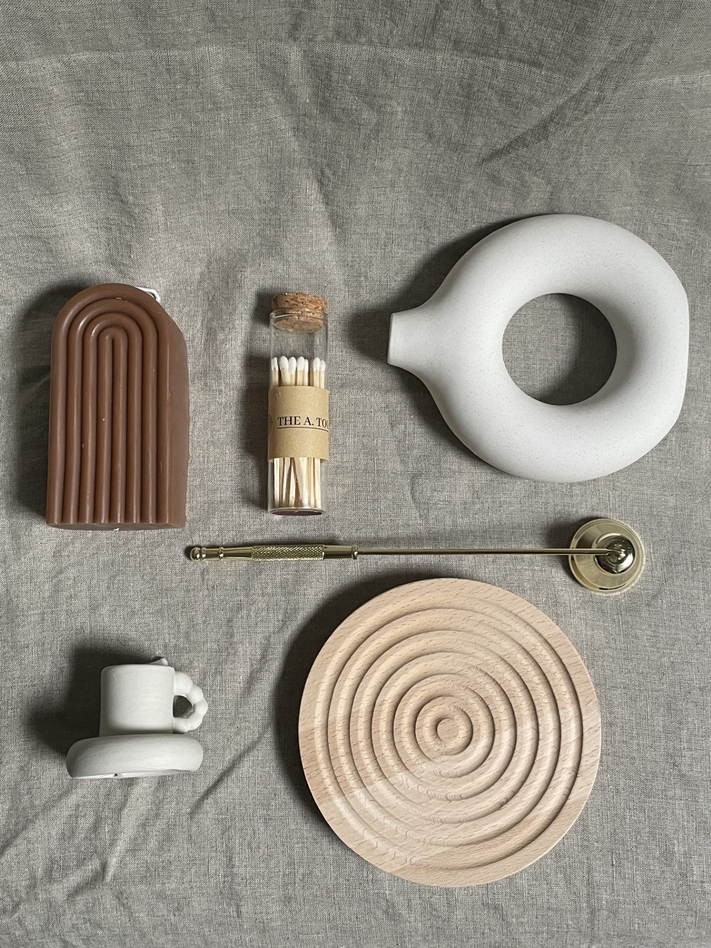 Inclus: vase, plateau en bois, bougeoir, bougie en arc, allumettes et éteignoir
