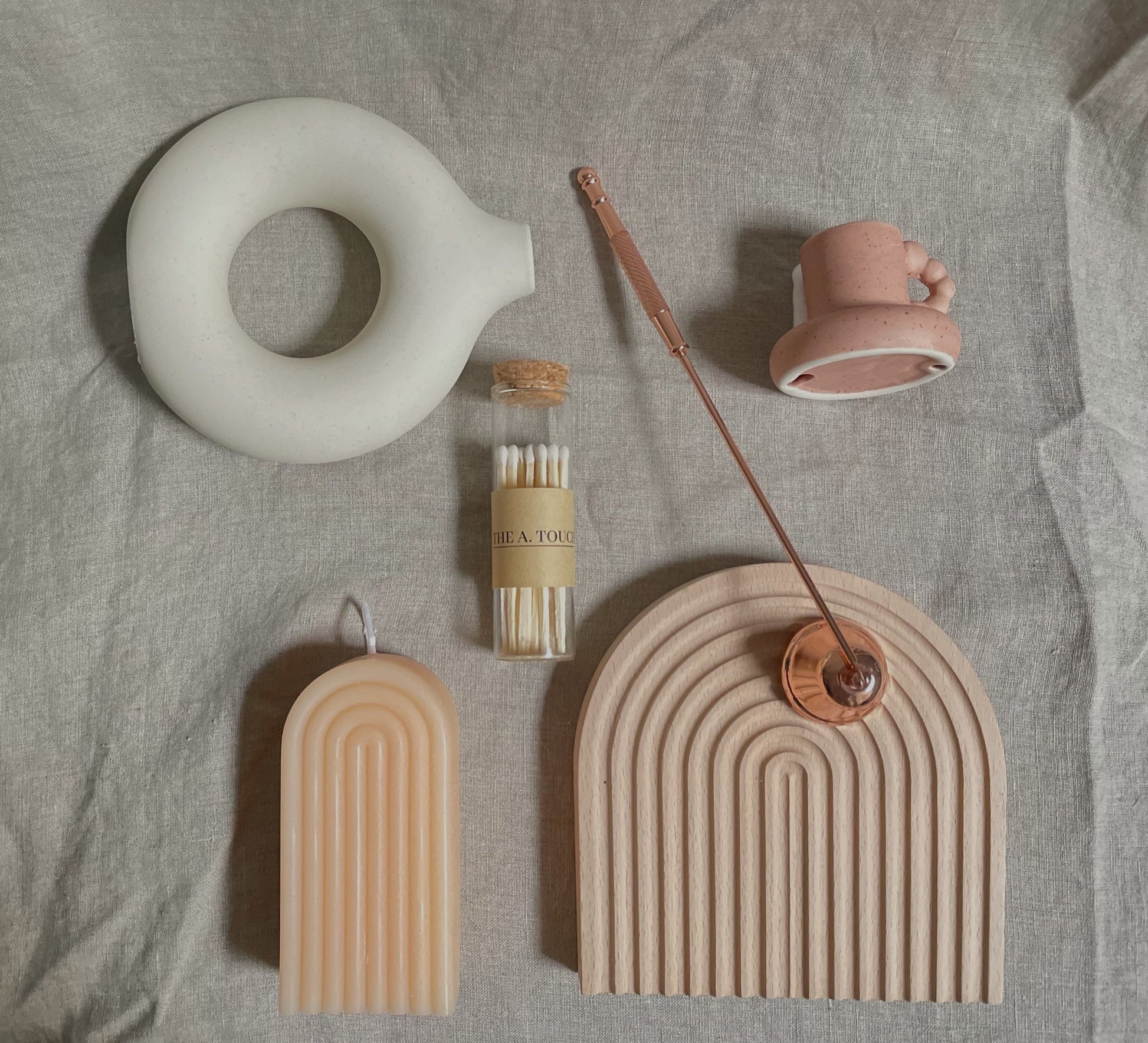Includes: vase, wooden tray, candle holder, arc candle, matches and flame stopper
